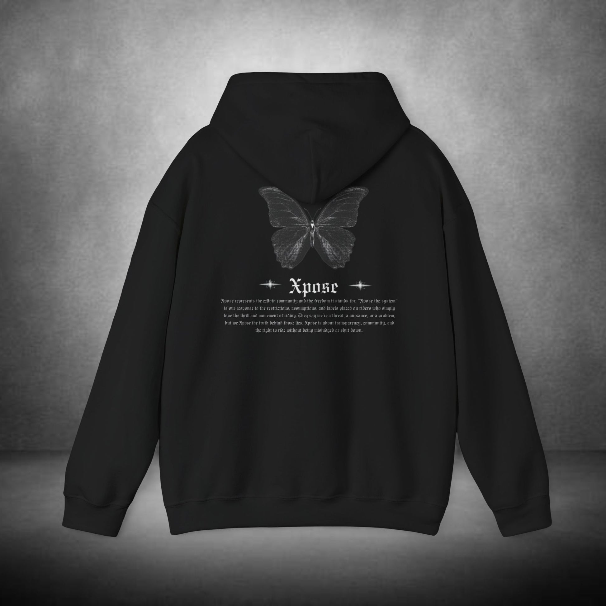 A soft, mid-weight hoodie that reads like a quiet statement. The front bears a vintage-style gothic logo with a small winged detail; the back opens into a faded, detailed butterfly and a line of delicate text that feels like a whispered manifesto. It wears oversized without being bulky, with a double-lined hood and color-matched drawcord for a clean, considered finish. Slip your hands into the roomy kangaroo pocket, feel the smooth 50/50 cotton–poly blend, and let the subtle monochrome artwork do the talking — comfortable enough for long walks, layered city days, or slow mornings at home.